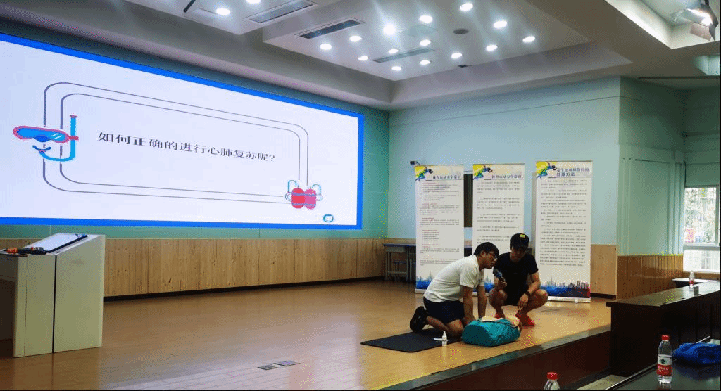 张德东老师游泳团队结合夏季“防溺水安全教育”,从游泳安全知识、急救知识进行讲解,并结合道具演示溺水的救护方法。最后,讲座在“防溺水六不”宣誓声中终落下帷幕。