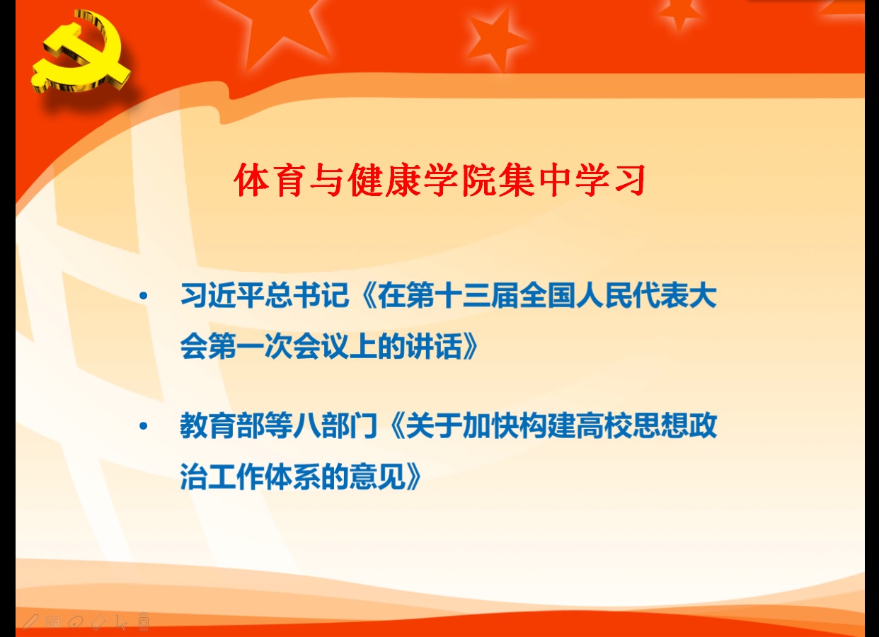 集中学习讨论:习近平总书记《在第十三届全国人民代表大会第一次会议上的讲话》;教育部等八部门《关于加快构建高校思想政治工作体系的意见》。