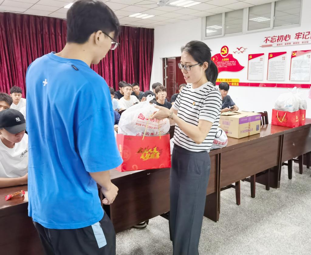 冉书记表示,同学们要深入学习贯彻习近平总书记关于“家国情怀、传统节日文化”的重要精神,弘扬优秀传统文化。在新时代烨烨生辉,是每位青年大学生身上肩负的使命。随后,冉书记为各年级学生代表发放牛奶、咸鸭蛋及零食大礼包。