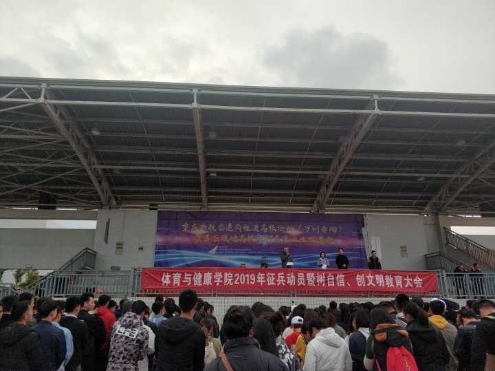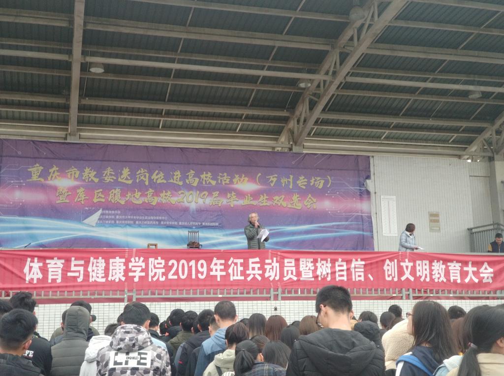 2019年3月24日下午在百安校区田径运动场,我院召开2019年征兵动员暨树自信、创文明教育大会。党总支书记漆勇、学工办副主任胡彩凤、辅导员陈果、佘港,班主任何兴权、陈亿、许庆、李文亚、郑晓老师出席会议,全院学生参加,会议由学工办副主任胡彩凤主持。