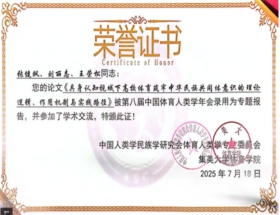 我院两名研究生在指导教师的指导下,历经选题、内容修订、投稿及大会遴选等多轮环节,投稿被大会录用并以专题报告形式进行了学术交流。其中,梁欣同学(刘铮教授指导)的《民族传统体育符号铸牢中华民族共同体意识研究》,系统阐释了民族传统体育符号作为文化载体在铸牢中华民族共同体意识中的独特价值与实现机制;张健飒同学(刘丽志博士指导)的《具身认知视域下高校体育铸牢中华民族共同体意识》,从具身认知理论出发,深入剖析高校体育教学实践中身体体验与文化认同的内在互动机制,为新时代体育教育促进民族团结工作提供了路径参考。